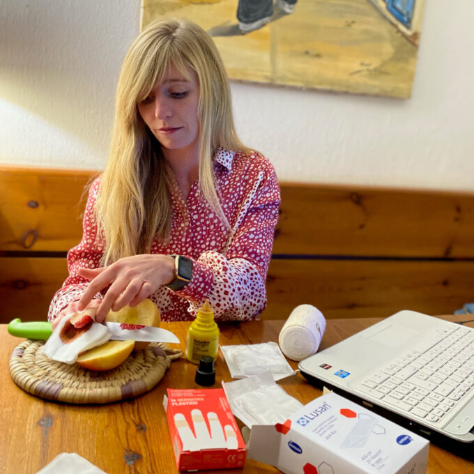 - mit einer keimfreien Wundauflage direkt auf die stark blutende Wunde drücken
