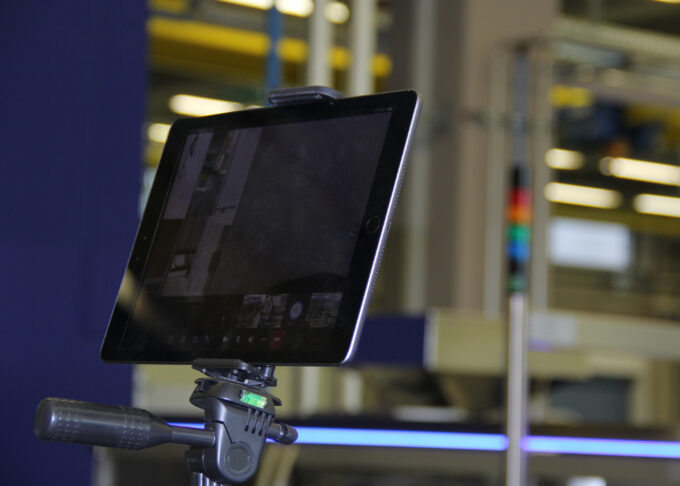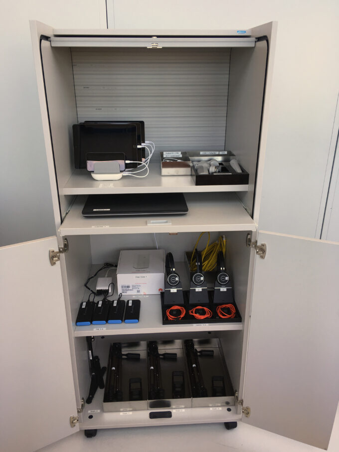 Das Team entwickelte eine Lösung, die zwar auch Rollen hat, aber deutlich kompakter ist: ein Schrank, bestückt mit drei iPads, einem iPhone, einem Gigacube, um die WLAN-Verbindung sicherzustellen, einem Notebook, vier Powerbanks, drei Headsets, drei Stativen, einem Gimbal, das bei Smartphones für Stabilität sorgt, einer Ladestation und Zubehör. Damit funktioniert eine Maschinenabnahme dann fast wie ein gewöhnliches Teams-Meeting – statt Gesichtern sehen Kunden aber ihre Maschine.