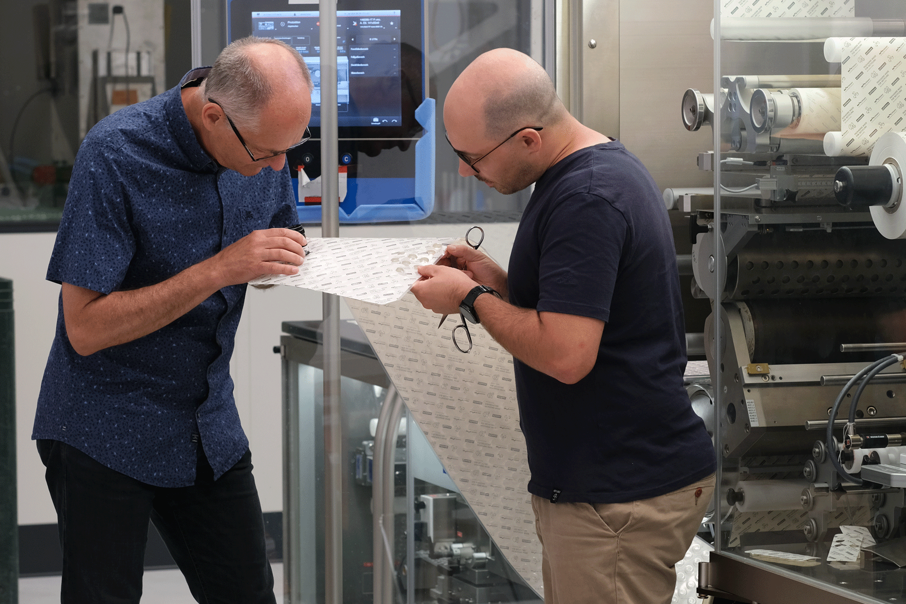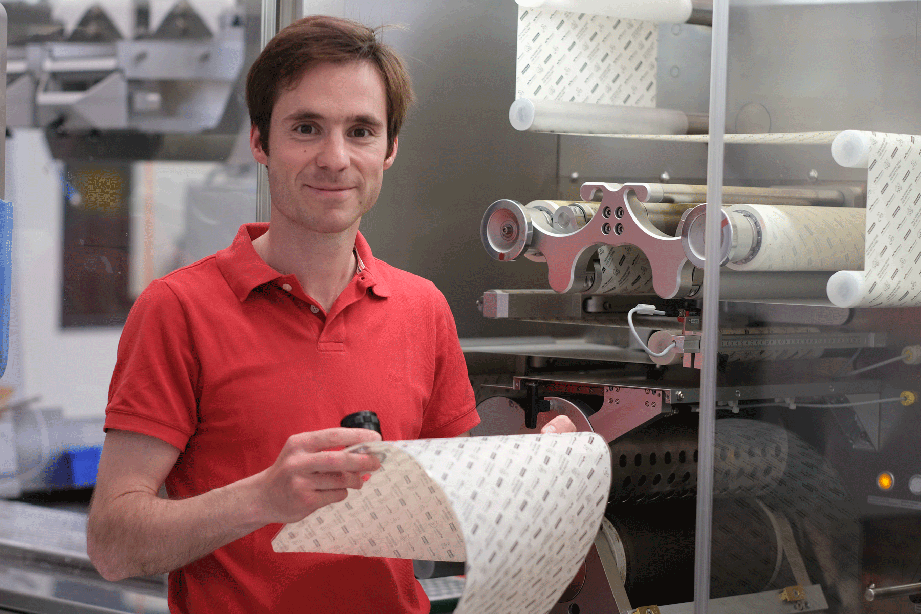 Handfester geht es bei den Prozessingenieuren im Team zu. Sie prüfen und optimieren die Abläufe an unseren Maschinen. Krahl nennt ein Beispiel: „Wir haben einen Siegel-Prozess in unseren Blistermaschinen, bei dem zwei Folien zusammengeklebt werden. Das ist ein sehr komplexer Ablauf, der hohe Anforderungen an die Konstruktion stellt.“ Die Herausforderung: Es kommen unterschiedliche Kunststofffolien in verschiedenen Kombinationen zum Einsatz. Jedes Material verhält sich auf der Maschine anders. Das macht den Prozess hoch variabel und schwer zu berechnen. „Genau solche Themenfelder packen die Prozessingenieure an“, sagt Krahl. „Sie fahren viele Maschinentests, überprüfen den Prozess und das Prozessfenster für unterschiedliche Kombinationen.“