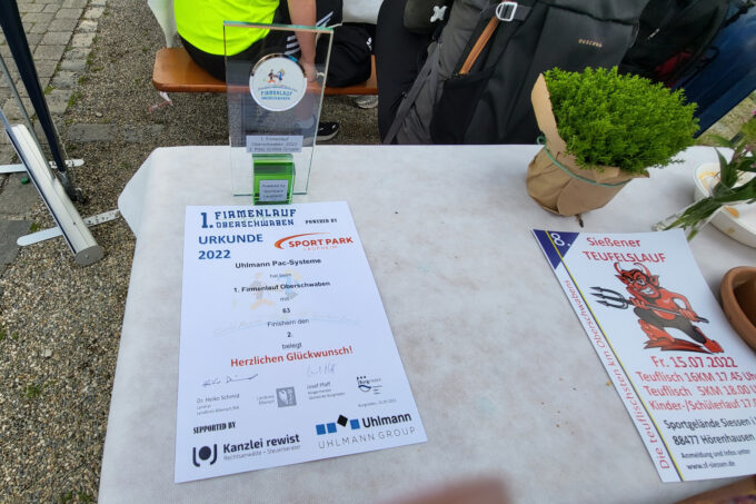At the Uhlmann tent, I meet satisfied, exhausted finishers. With a voucher, I can also replenish my calories with a refreshing drink and delicious food. At the award ceremony, we Uhlmann runners also received a number of certificates and trophies – so many, in fact, that it’s hard to keep track of every single one.”