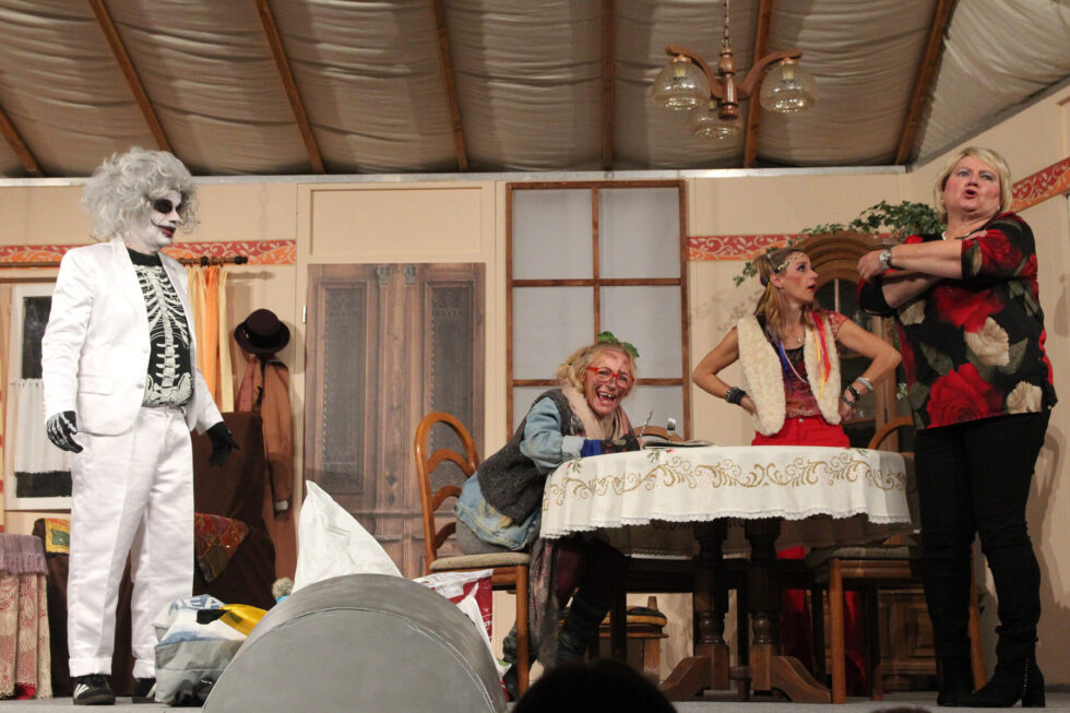 The Ingoldingen theater group has been in existence for over 40 years and currently consists of 30 people with different tasks, actors, stage construction/props, direction, technology. Not forgetting the prompter, the most important person according to Fabian – sometimes one look from her is enough to remember the right text. That’s what you call a well-coordinated team! Unadulterated, means without microphones, the team thrills around 170 spectators each year in 9 performances in the musicians’ home, always sold out to the last seat. At the dernière, the actors like to play tricks on each other, e.g. there is salt instead of sugar in the coffee or water suddenly comes out of the shower head….